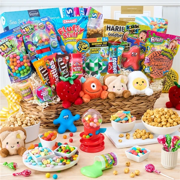 This incredible Candy and Plush Mega Basket is the perfect gift for any occasion, with a variety of toys, candies, and snacks that are sure to impress. Whether it’s for a birthday, Valentine’s Day, Easter, Halloween, Christmas, or Hanukkah, this basket has got you covered. The basket includes some of the most popular Palm Pals, which are very adorable. Your recipient will enjoy munching on freshly popped popcorn and indulging in an assortment of candies while playing with Flarp, Lil’ Hands, and many other fun toys.