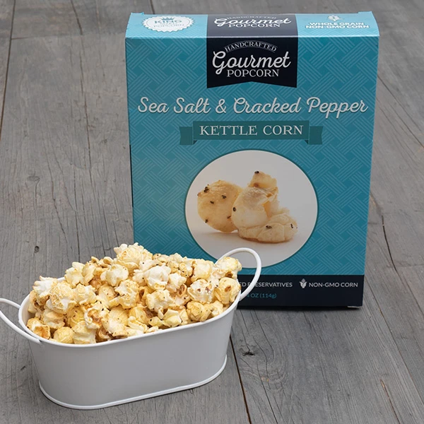 - Sea Salt & Cracked Pepper Kettle Corn by GourmetGiftBaskets.com – 4 oz.