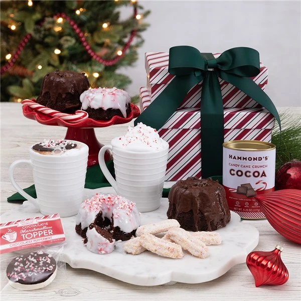 Experience the joy of our Cocoa and Sweet Bundt Cakes Gift Tower, a delightful holiday treat perfect for Christmas gift-giving. Your loved ones will indulge in rich hot cocoa that warms both hands and hearts, accompanied by delicious mini bundt cakes that are pure bliss with every bite. We’ve included delicious peppermint-flavored cookies that pair perfectly with a cup of hot cocoa. Also included are chocolate marshmallow cocoa toppers that put this decadent treat over the top. Embrace the warmth, sweetness, and holiday magic in one delicious package.
